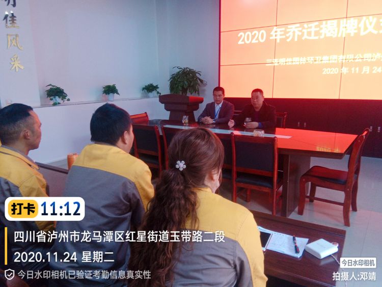 2020年11月24日,明佳集團(tuán)瀘州分公司新辦公室喬遷儀式隆重舉行。人大主任詹萬勇,區(qū)綜合行政執(zhí)法局環(huán)衛(wèi)股股長趙耿、重慶中仁公司昌總等領(lǐng)導(dǎo)來到明佳集團(tuán)瀘州分公司新辦公場地,為煥然一新的辦公樓正式啟用進(jìn)行喬遷揭牌。集團(tuán)公司生產(chǎn)質(zhì)安部副經(jīng)理鞠彬、集團(tuán)公司生產(chǎn)質(zhì)安部副經(jīng)理段永強(qiáng)、綜合辦公室、財(cái)務(wù)部、各部門管理人員共同見證這一歡慶時(shí)刻。