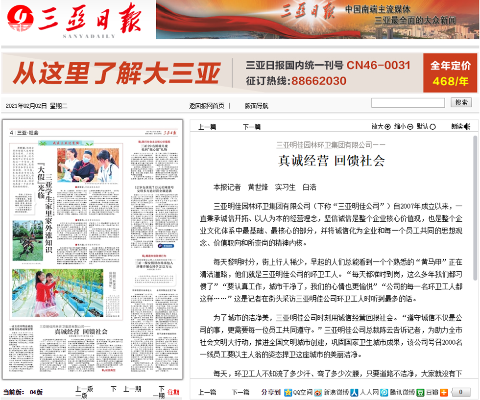 三亞明佳園林環(huán)衛(wèi)集團(tuán)有限公司(下稱“三亞明佳公司”)自2007年成立以來,一直秉承誠(chéng)信開拓、以人為本的經(jīng)營(yíng)理念,堅(jiān)信誠(chéng)信是整個(gè)企業(yè)核心價(jià)值觀,也是整個(gè)企業(yè)文化體系中···